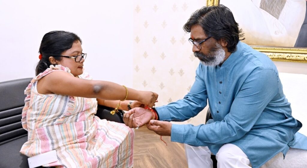 दुमका जिला निवासी मति सोरेन ने मुख्यमंत्री हेमन्त सोरेन की कलाई में बांधा रक्षासूत्र
