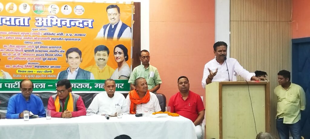 इस अवसर पर भाजपा महानगर अध्यक्ष राजेंद्र मिश्रा ने कहा कि भारतीय जनता पार्टी की प्रभाव को और हमें बढ़ाना है लोकसभा के चुनाव में कांग्रेस और समाजवादी पार्टी के लोगों ने खटाखट के नाम पर दुष्प्रचार फैलाया और कहा कि हमें अपनी कमी को दूर करना है और पार्टी के प्रति अपनी जिम्मेदारी निभाना है कार्यकर्ताओं की मेहनत के बल पर हम शहर दक्षिणी विधानसभा को जीता है कांग्रेस की सरकार में भ्रष्टाचार, आतंकवाद, नक्सलवाद, और गुंडाराज का आलम रहा है और आज मोदी की सरकार में देश का सर्वांगीण विकास हो रहा है और आज मोदी और योगी के राज में उत्तर प्रदेश गुंडाराज, दंगाराज ,भ्रष्टाचार, से मुक्त हो रहा है और कहा कि कार्यकर्ता आगामी विधानसभा चुनाव के लिए कमर कस तैयारी करें और केंद्र और प्रदेश की सरकार योजनाओं को जन-जन तक पहुंचाएं इसके पहले