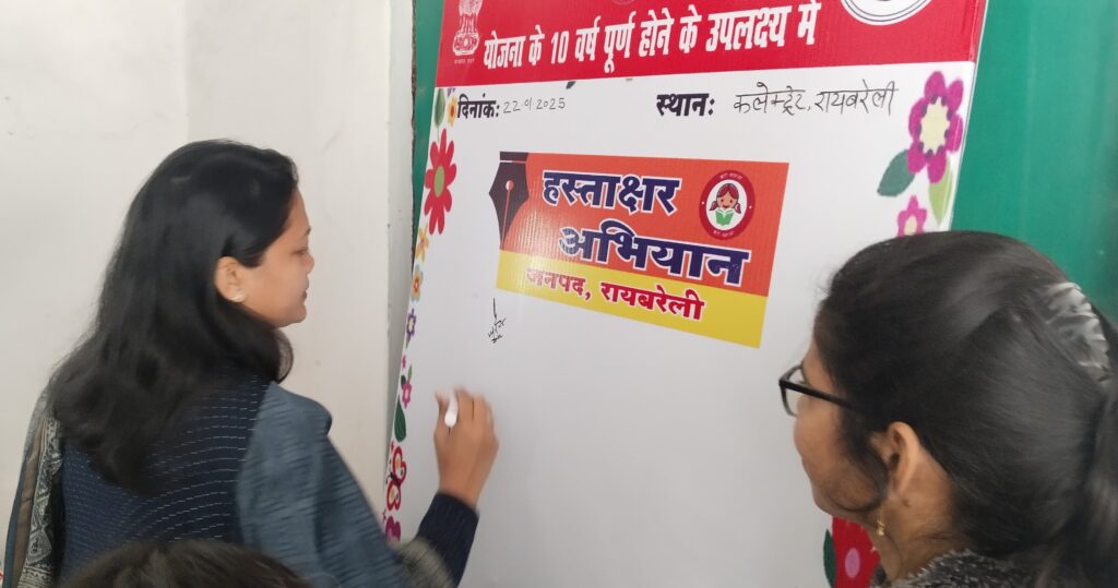 रायबरेली। जिलाधिकारी हर्षिता माथुर ने बेटी बचाओं बेटी पढ़ाओं योजना के दस वर्ष पूर्ण होने पर कलेक्ट्रेट कार्यालय में हस्ताक्षर अभियान का शुभारम्भ किया। इस मौके पर अपर जिलाधिकारी (प्रशासन) सिद्धार्थ, अपर जिलाधिकारी (वि0रा0) अमृता सिंह, जिला प्रोबेशन अधिकारी जयपाल वर्मा सहित अन्य अधिकारियों ने भी हस्ताक्षर अभियान में अपने हस्ताक्षर कर हिस्सा लिया।